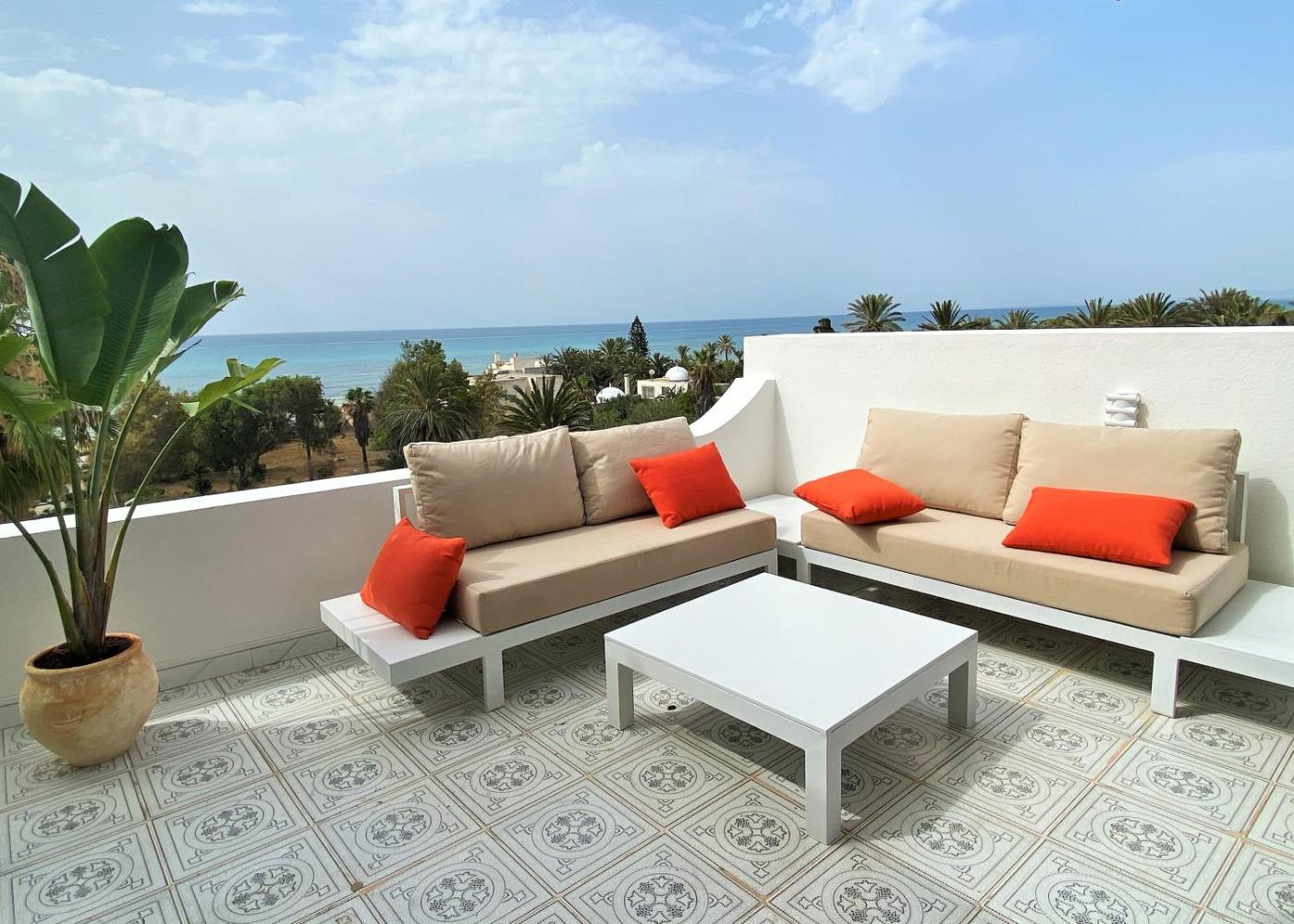 A recently renovated property, Roof Top Pied dans lEau Panoramic View, 80 meters from Seaside isin Hammamet near Hammamet Beaches, Kasbah of Hammamet and Carthageland Hammamet. This beachfront property offers access to a balcony. Outdoor seating is also available at the apartment.